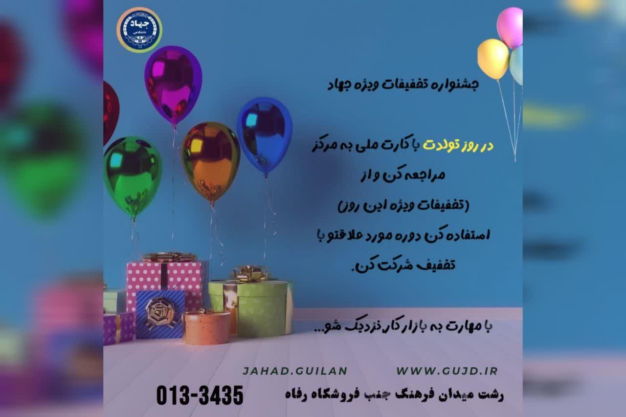 در روز تولد خود به همراه کارت ملی به مراکز جهاد دانشگاهی گیلان مراجعه نموده و با شرکت در دوره موردعلاقه خود از تخفیفات ویژه این روز بهره مند گردید.