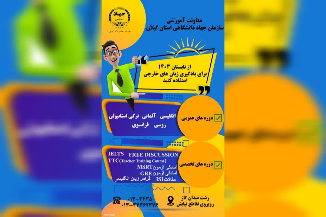 برای کسب اطلاعات بیشتر و ثبت نام در ترم تابستان با شماره ۳۴۳۵-۰۱۳ تماس حاصل نمایید و یا به آدرس رشت- تقاطع غیرهمسطح نیایش (میدان گاز) - ابتدای خیابان نامجو- مرکز زبان های خارجی جهاد دانشگاهی مراجعه فرمایید.